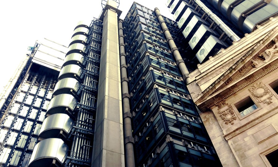 When the LLoyds companies had outgrown their old buildings they erected on top of the old one an extraordinary new construction in the very centre of the city of London. The glass and concrete design was a spectacular novelty, but it led to a serious problem: you could not hide the necessary pipes and elevators of the building within the walls. So the architect, Richard Rogers found an extraordinary solution. He simply put the pipes outside the building. Today of course the building is famous for its style, and probably holds a good deal of responsibility for the weird shapes and sizes of the skyscrapers, following over the next decades.